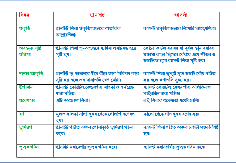 ৩. গ্রানাইট ও ব্যাসল্ট শিলার মধ্যে পার্থক্য লেখা: